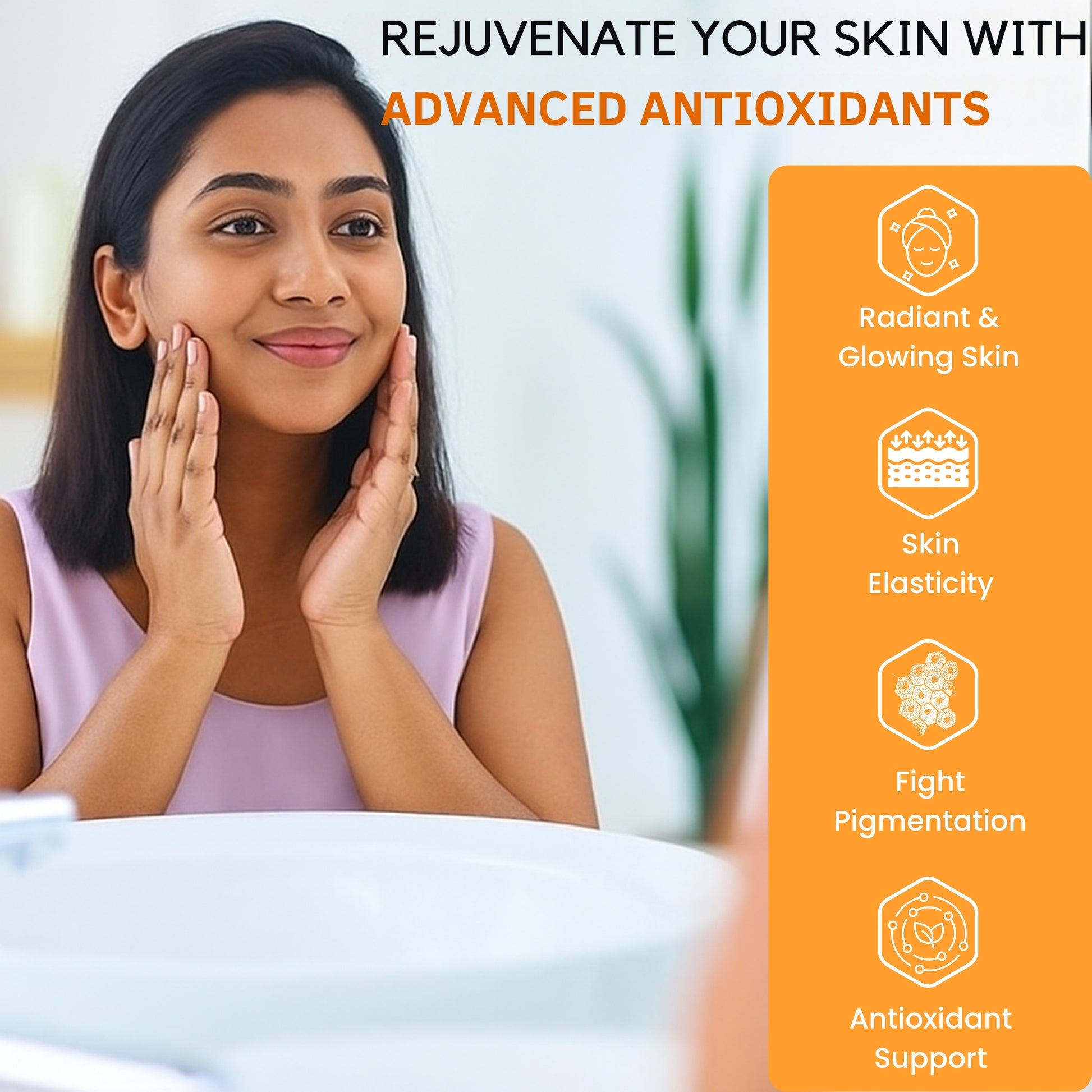 Glutathione, Vitamin C & Superfruits reduce dullness and improve overall skin tone.